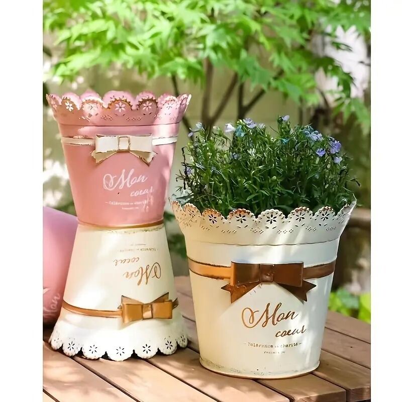 植木鉢 フラワーポット ヴィンテージ風 金属製 排水ホール付き ガーデンパット アンティーク プランター コンテナ ホワイト ピンク グリーン パープル おしゃれ 庭 屋内 | Bellechan Shop 女性のためのインテリア