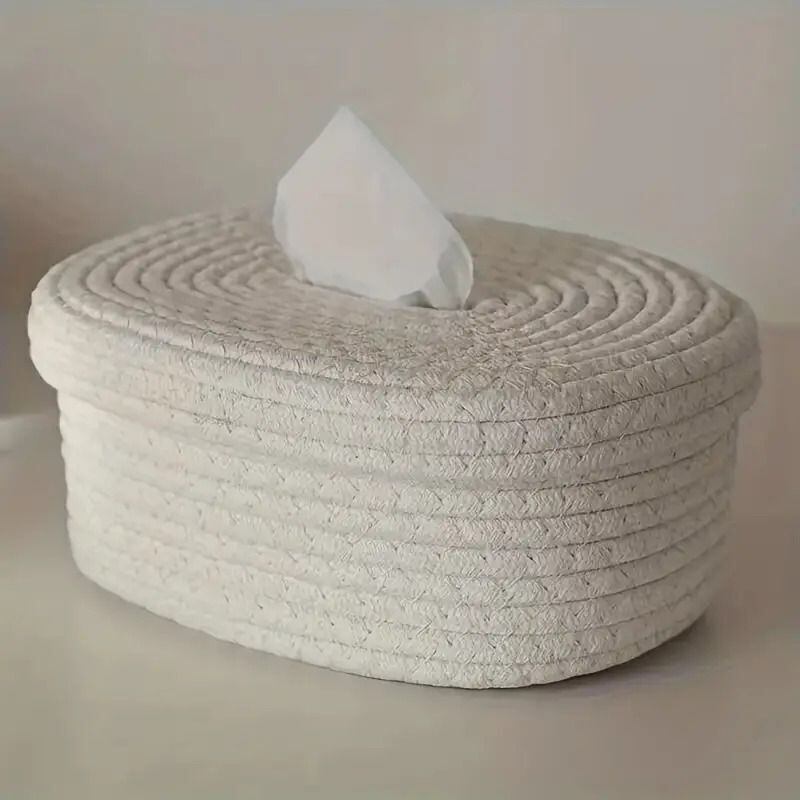 楕円形の綿ロープでできたこのティッシュボックスカバーは、お部屋に自然な温かみをプラスしてくれます。