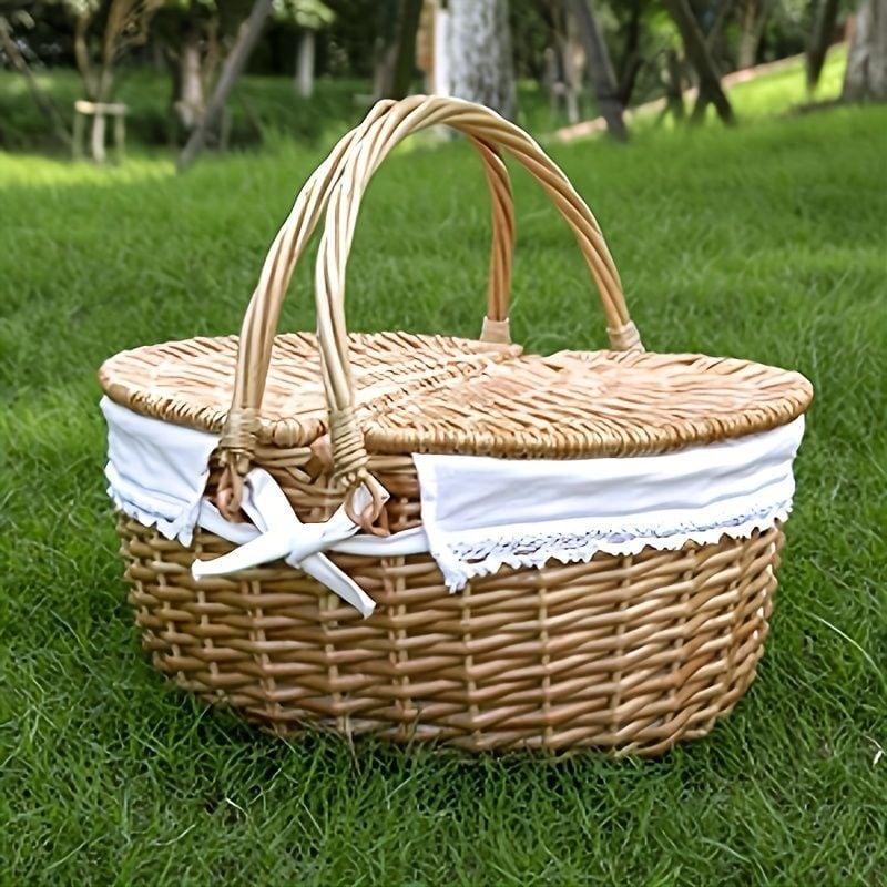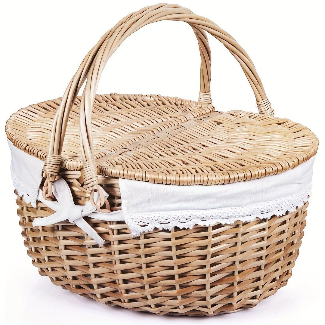 ラタンピクニックバスケット 蓋付き クラシック ウィッカー 屋外 ダブルドア デザイン ホワイトライニング付き お出かけ 籐編み細工 かわいい 天然藤 | Bellechan Shop 女性のためのインテリア