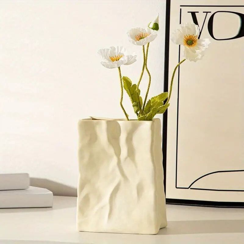セラミックのフラワーベースは、不規則な折り目が特徴的なアイテムです。