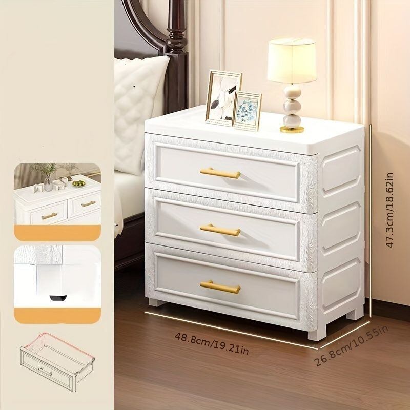 3段プラスチック収納キャビネットは、上品な白色とモダンなデザインが特徴のアイテムです。引き出し式の収納スペースが3段あり、寝室やリビングルーム、オフィスなどの様々な場所で使用できます。おしゃれでシンプルな外観は、どんな部屋にも調和してくれること間違いなし!収納力もしっかりと備えているので、雑多になりがちな部屋をスッキリ整理できます。