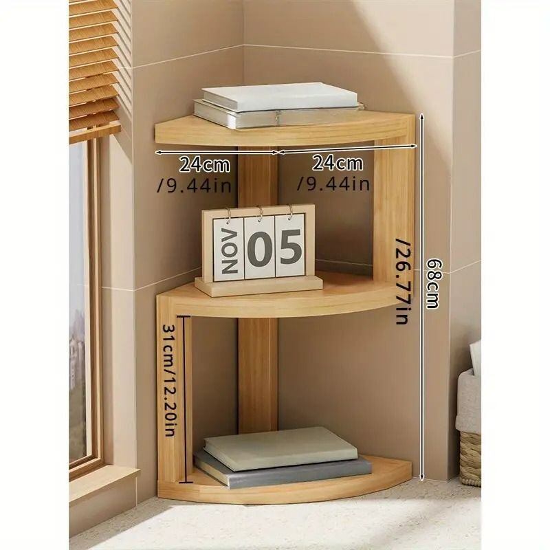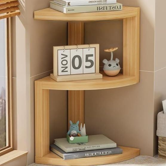 木製のナチュラルなコーナーシェルフは、デスクの隅を有効活用するのに最適です。