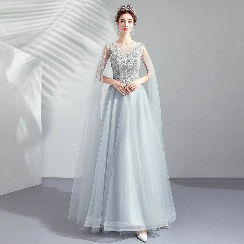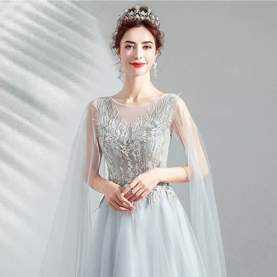 イブニングドレス グレー 大きいサイズ ロング丈 綺麗 レース フェミニン 薄手 エレガント ハイウエスト ノースリーブ 発表会 ウェディング ウェディングドレス 舞台 発表会 写真撮影 | Bellechan Shop 女性のためのインテリア